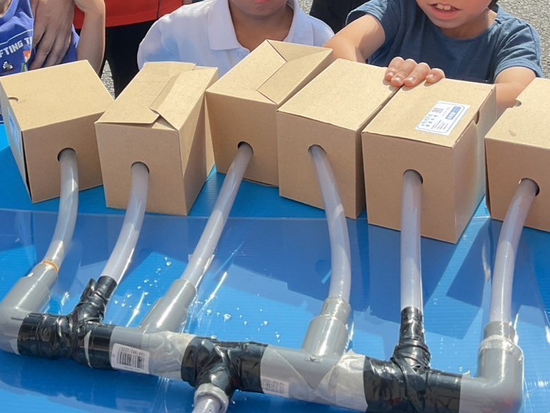 大きい空気砲を見てもらったあとは、持ち帰ってもらう「ミニ空気砲」で遊んでもらいます。