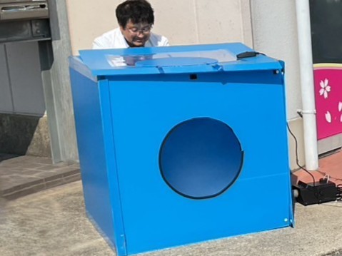 今回は、初めての屋外での空気砲実験を行いました…が、風がきつかった(笑)